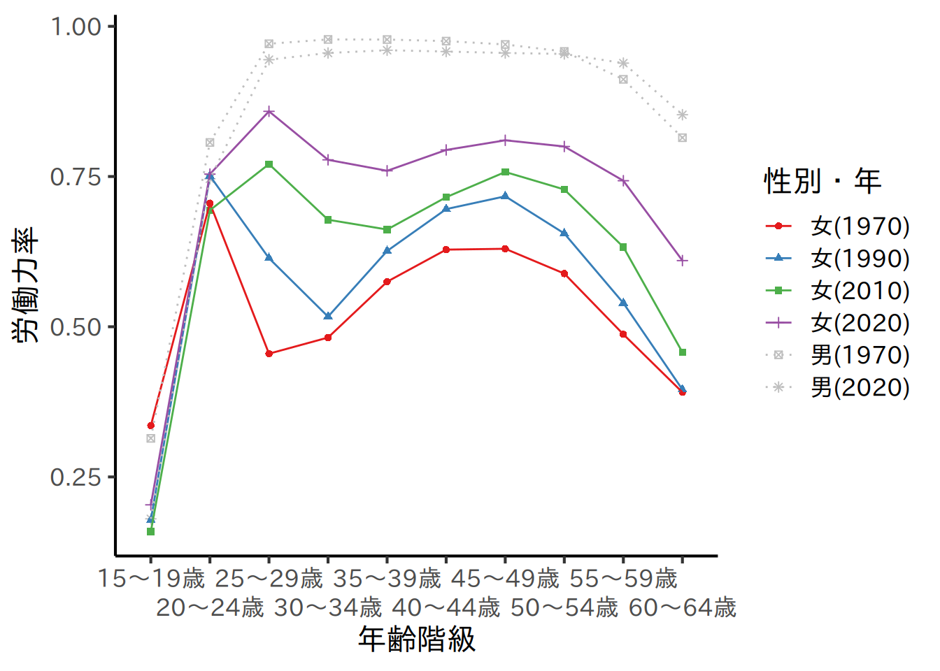 mutate(`25~54歳` = `25~34歳` + `35~44歳` + `45~54歳`) |> # 25~54歳までをまとめる